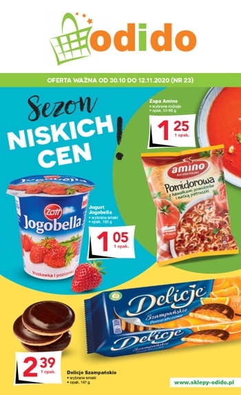 'Sezon niskich cen!' - nowa gazetka promocyjna sklepów Odido. Polecane promocje z gazetki Odido: Zupa Amino wybrane rodzaje - 1,25 zł. Jogurt Jogobella Zott 150 g - 1,05 zł. Delicje Szampańskie 147 g - 2,39 zł. Oferta…