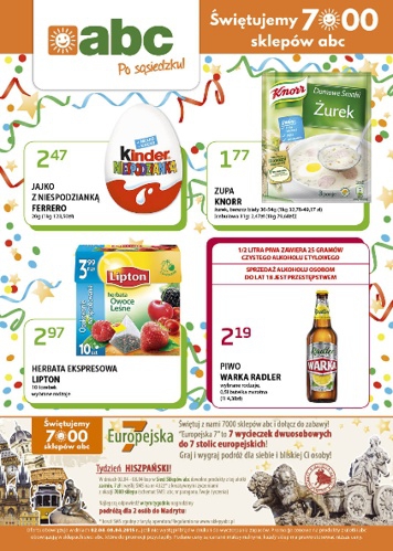 Nowa gazetka promocyjna sklepów ABC - "Świętujemy 7000 sklepów ABC". Polecane promocje z gazetki ABC: Jajko z niespodzianką Kinder Ferrero 20 g - 2,47 zł. Zupa Knorr różne rodzaje - 1,77 zł. Herbata ekspresowa Lipton 10 torebek -…