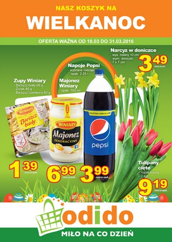 Nowa gazetka promocyjna sklepów Odido - "Nasz koszyk na Wielkanoc". Polecane promocje z gazetki Odido: Pepsi 2,25 L - 3,99 zł. Narcyz w doniczce - 3,49 zł. Zupy Winiary różne rodzaje - 1,39 zł. Oferta ważna od…