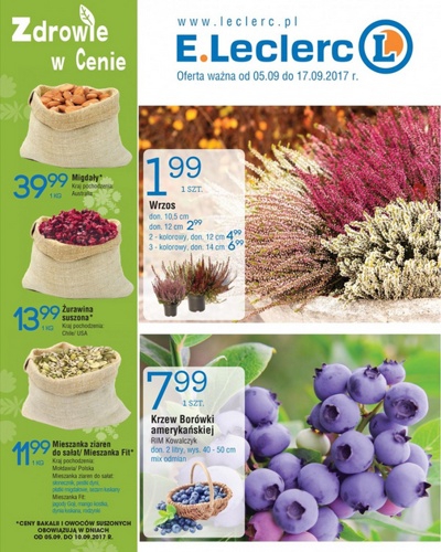 {loadposition linkEleclerc} Nowa gazetka promocyjna sieci handlowej E.Leclerc - "Zdrowie w cenie". Polecane promocje z gazetki E.Leclerc: Migdały 1 kg - 39,99 zł. Żurawina suszona 1 kg - 13,99 zł. Mieszanka ziaren do sałat 1 kg…