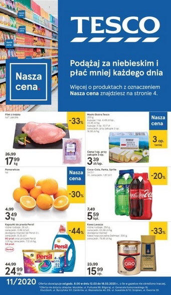 ’Podążaj za niebieskim i płać mniej każdego dnia’ – nowa gazetka promocyjna sieci sklepów Tesco.