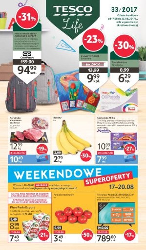 Na okładce gazetki Tesco na uwagę zasługuje plecak młodzieżowy CoolPack Impact z dwiema pojemnymi przegrodami, kieszenią na laptopa i okulary, wzmocnionym spodem zabezpieczającym plecak przed przetarciami i uszkodzeniem w cenie 94,99 zł, 4 bloki rysunkowe TOP-2000 Creatino za 9,99 zł czy pastele olejne marki Pentel w 12 kolorach za jedyne 6,29 zł, a także Weekendowe superoferty, tj. Piwo Perła Export w puszce 4×500 ml za 7,49 zł, pomidory malinowe 1 kg za 3,49 zł i telewizor LED 32 cale Akai LET32FHD3283 w cenie 789 zł. Kolejne strony gazetki Tesco to artykuły dla dzieci i młodzieży, np. seria Powtórka przed maturą, która pozwala usystematyzować wiedzę przed egzaminem maturalnym za 19,99 zł, książeczki edukacyjne z bohaterami Disneya za 14,99 zł, Repetytorium gimnazjalisty z testami i ćwiczeniami pozwalającymi utrwalić wiedzę za 12,99 zł, zabawka My Little Pony stylowa grzywa za 47,99 zł, lalka klasyczna Disney Princess za 63,99 zł czy kredki trójkątne Jumbo w 10 kolorach za 8,99 zł.