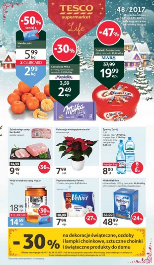 Pierwsza strona aktualnej gazetki promocyjnej Tesco prezentuje mandarynki w cenie 2,99 zł za 1 kg z kartą Clubcard, czekoladę Milka 100 g za 2,49 zł, cukierki Celebrations Mars 600 g za 19,99 zł, schab wieprzowy bez kości w opakowaniu vacuum 1 kg za 9,49 zł, poinsecję wielopędową małą w cenie 7,99 zł za 1 sztukę, wodę Żywiec Zdrój 6×1,5 L za 8 zł, miód wielokwiatowy Huzar 1 kg za 18,99 zł, papier toaletowy Velvet 12 rolek za 7,99 zł i mleko Bebilon 1200 g za 48,99 zł.