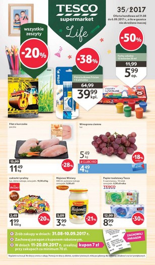 Na okładce najnowszej gazetki promocyjnej Tesco znajdziemy artykuły wymienione powyżej w Polecanych promocjach z gazetki, a także winogrona ciemne 1 kg za 4,49 zł z kartą Clubcard, cukierki i praliny Mieszko w cenie 1,99 zł za 100 g, majonez Dekoracyjny Winiary 400 ml za 3,99 zł i papier toaletowy Tesco 10 rolek za 8,99 zł. Dwie następne strony zostały poświęcone akcji promocyjnej Zbieraj znaczki i zyskaj rabat na ekskluzywne produkty Tefal, zaś kolejne dwie promocji z kartą Clubcard, dzięki której możesz zaoszczędzić 5 zł kupując wszystkie produkty z czwartej strony, czyli sałatę lodową 1 sztukę za 1,29 zł, szynkę od szwagra Krakus 100 g za 2,99 zł, ryż Risana 4×100 g za 2,39 zł, bombonierkę Merci 250 g za 12,99 zł i ręcznik kuchenny Springforce 2 rolki za 2,99 zł. Następne strony gazetki to akcje promocyjne: Sezon na winogrono, Owoce w butelce, Sięgnij po świeżość, Tradycyjnie aromatycznie, Ulubiona od pokoleń i Smaczne przekąski do szkoły.