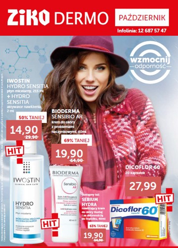 Na okładce najnowszej gazetki promocyjnej Ziko Dermo znajdziemy płyn micelarny Iwostin Hydro Sensitia 215 ml + aktywator nawilżenia Hydro Sensitia 2 ml za 14,90 zł, krem do skóry z problemami naczynkowymi Bioderma Sensibio AR 40 ml za 19,90 zł i Dicoflor 60 w cenie 27,99 zł za 20 kapsułek.