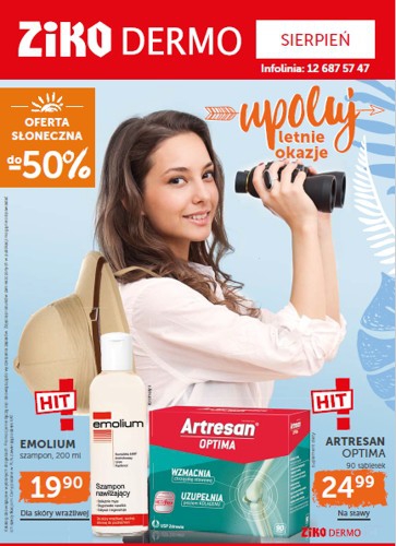 Sierpniowe wydanie gazetki promocyjnej Ziko Dermo podobnie jak poprzednie obfituje w mnóstwo promocji i rozpoczyna się od oferty słonecznej z rabatami do -50%. Na pierwszych stronach znajdziemy informację o produktach Iwostin i Dermedic tańszych o 50% czy produktach z serii słonecznej Vichy, Bioderma, A-Derma, La Roche-Posay, Pharmaceris i Avene z rabatem -40%. 4. i 5. strona prezentuje suplementy diety, tj. Trilac Plus, Aloe Vera Drinking Gel, soki z granatu, Skrzypovita czy Colon C Slim. Kolejne dwie strony to witaminy i minerały, mianowicie WMC wapń-magnez-cynk Aquamin dla zdrowych kości i zębów, Szelazo+SR, Calcium Duo Alegro na alegrie, Capivit A+E Forte System dla zdrowej skóry, Magleq B6 Max na zmęczenie, Osteovit 1000 na zdrowe kości czy multiwitamina z minerałami Centrum.